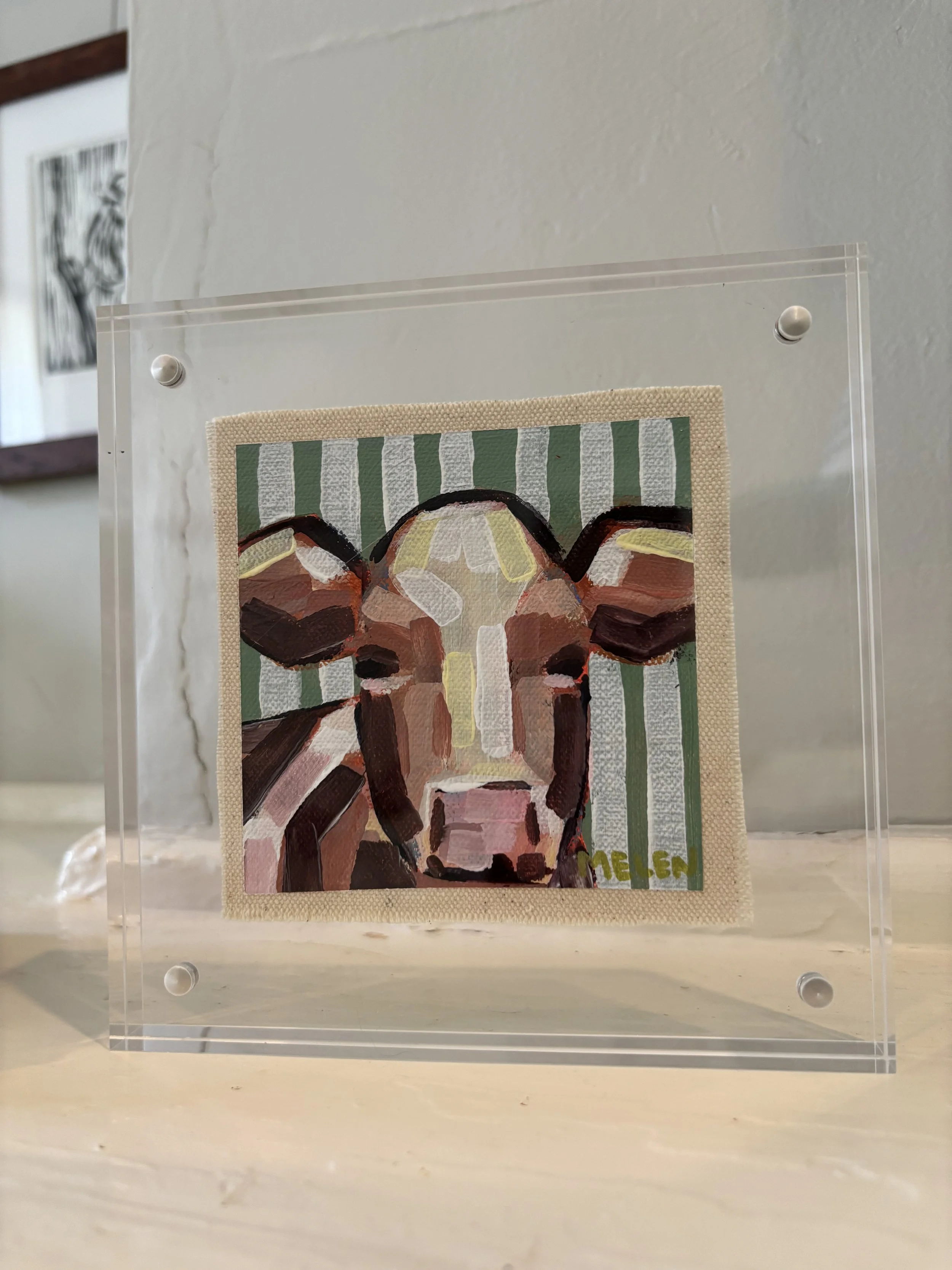 4×4” acrylic on raw canvas framed in a 6×6” acrylic frame.
